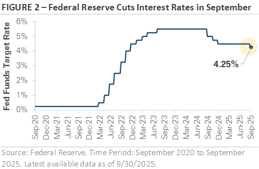 As expected, the Fed delivered a -0.25% rate cut in September, ending its 9-month pause (Figure 2). In his press conference, Fed Chair Powell framed the move as a “risk management” cut, describing it as a proactive step to keep the economic expansion on track rather than concern about a recession. The central bank updated its policy forecast to include two more rate cuts before year-end, with the potential for more in 2026. The revised forecast and Powell’s remarks signaled a measured and gradual rate-cutting cycle rather than an aggressive one.