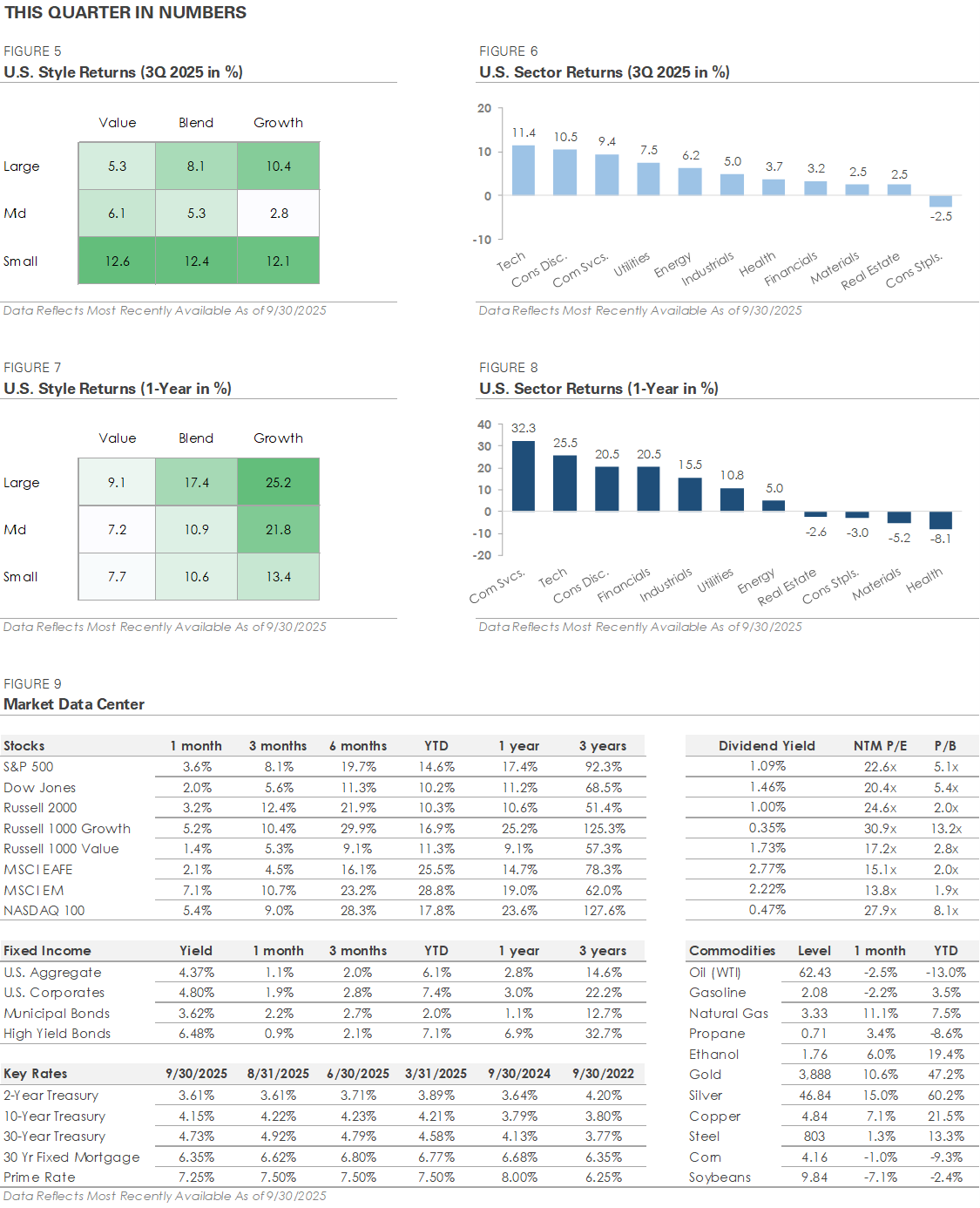 Markets carried their strong momentum from Q2 into Q3, with the S&P 500, Nasdaq, and small-cap stocks each hitting new highs. Investor sentiment remained optimistic despite soft labor market data and mixed economic signals, and stocks traded higher due to strong corporate earnings, the Federal Reserve’s pivot toward rate cuts, and easing trade tensions. The technology sector remained an important contributor, as artificial intelligence (AI) companies reported strong earnings growth. At the same time, improving market breadth added fuel to the rally, and small-cap stocks finally broke above their 2021 highs. In this letter, we recap Q3’s defining themes, review stock and bond market performance, and look ahead to the final quarter of 2025.