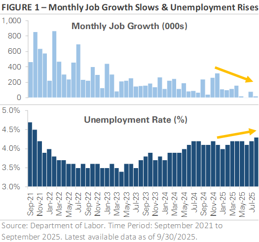 By late summer, cracks began to emerge in the labor market. Figure 1 shows job growth slowed sharply starting in May, with two consecutive months of weak job growth in July and August and negative revisions to prior months. The unemployment rate rose to 4.3%, the highest since 2021. While the labor data raised concerns about an economic slowdown, separate data showed consumer spending remained solid. Economic growth was still positive, but the economy was softening.