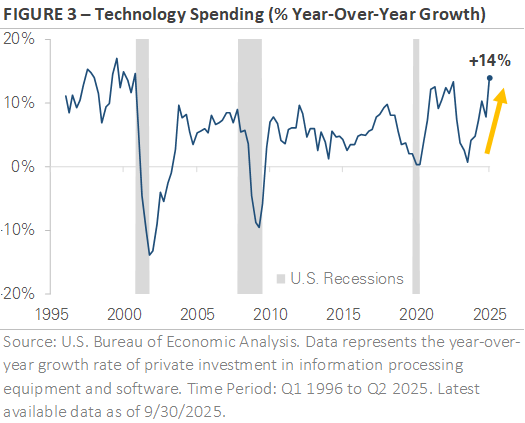 Artificial intelligence continued to be a top market theme during the quarter. Figure 3 shows technology-related investment grew +14% year-over-year in Q2, the second consecutive quarter and the fastest pace since the late 1990s. The spending is tied to the AI industry buildout, with billions being spent on high-performance computer chips, cloud architecture, data center construction, and the power and cooling needed to run it all. The spending boom has become a significant contributor to economic growth and helped offset softness in rate-sensitive areas, such as housing, manufacturing, and non-AI business investment.
