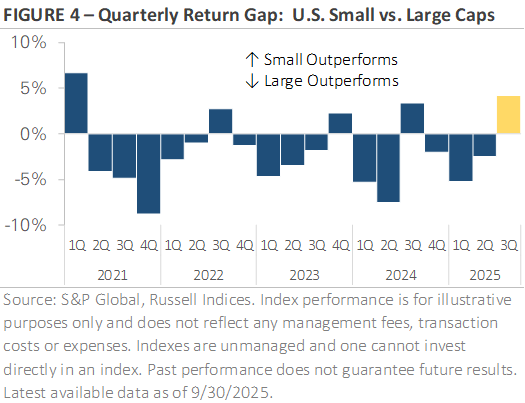 The S&P 500 gained more than +8% in Q3, bringing its year-to-date return to over +14%. Technology stocks remained a key driver, but broader market leadership also provided a tailwind. Small-cap stocks rallied sharply in anticipation of the Fed’s rate cut. The Russell 2000 surpassed its previous high from 2021 and returned nearly +12% as investors bet that rate cuts would benefit smaller companies. Figure 4 shows small caps posted their biggest quarter of outperformance over the S&P 500 since Q1 2021. In another sign of the market’s optimism, cyclical sectors broadly outperformed their defensive counterparts.
