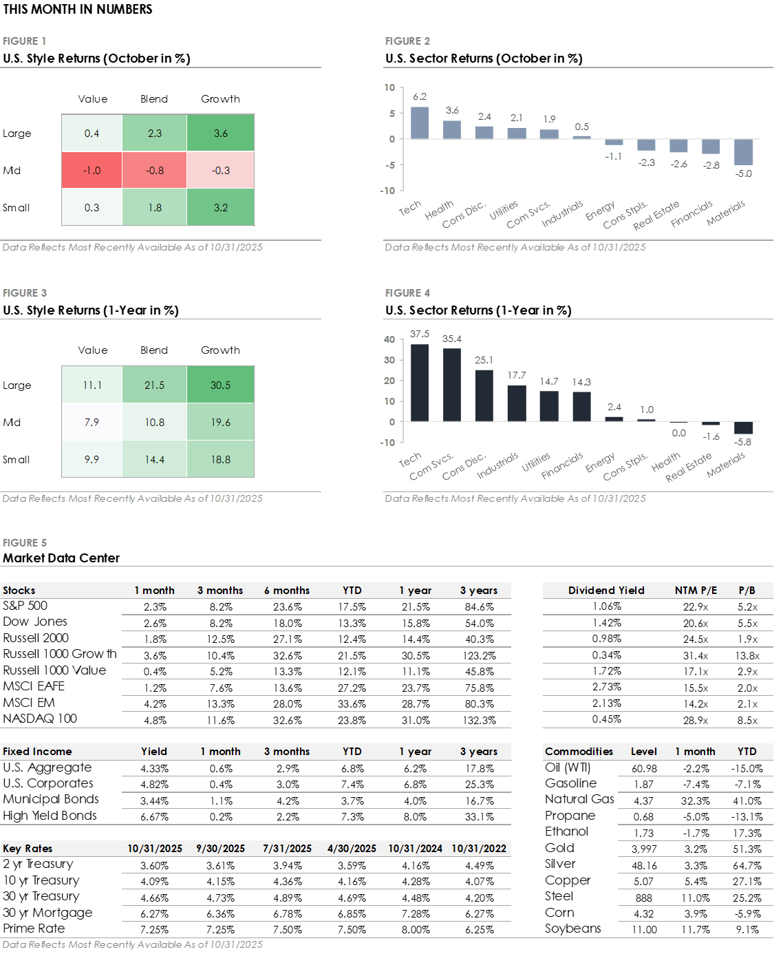 - Large Cap Growth stocks gained +3.6% and outperformed the index, while Large Cap Value returned +0.4%. Major stock indices set new highs, with the S&P 500, Dow Jones, Nasdaq 100, and Russell 2000 all posting a sixth straight month of gains.